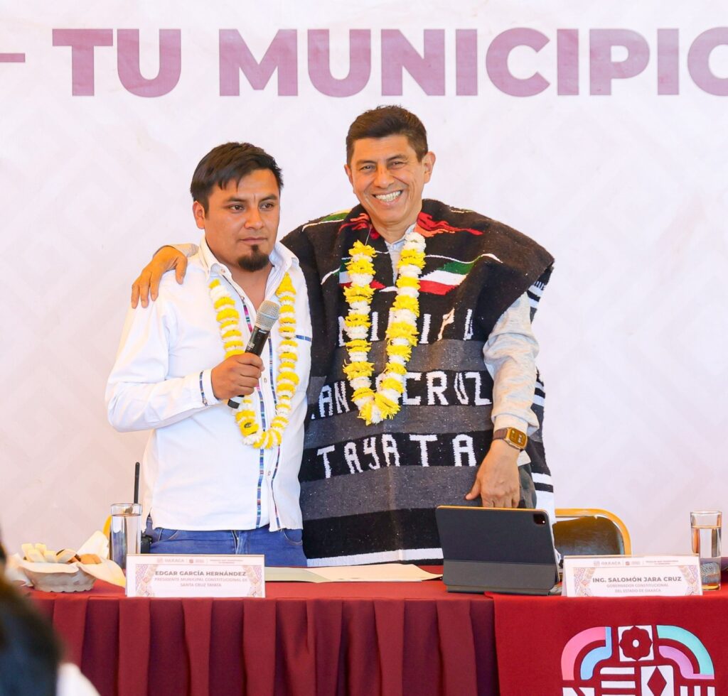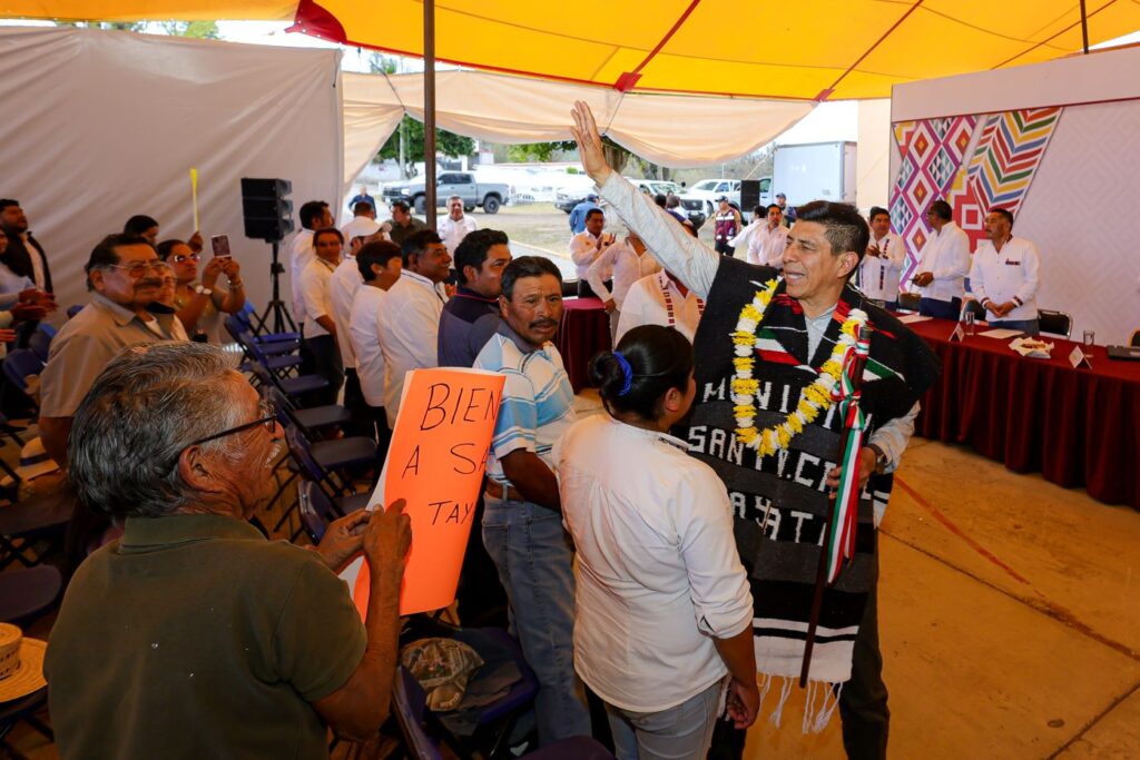Santa Cruz Tayata, Oax., 28 de enero de 2024.- En este municipio que significa Hombre sabio, el Gobernador del Estado, Salomón Jara Cruz informó el nuevo modelo de atención que están llevando a las comunidades a través de la estrategia Trabajo que Transforma Tu Municipio, para que cuenten con mejores condiciones de vida, con mejor infraestructura social y educativa, caminos pavimentados, servicios de salud, apoyo a jefas de familia y grupos prioritarios.