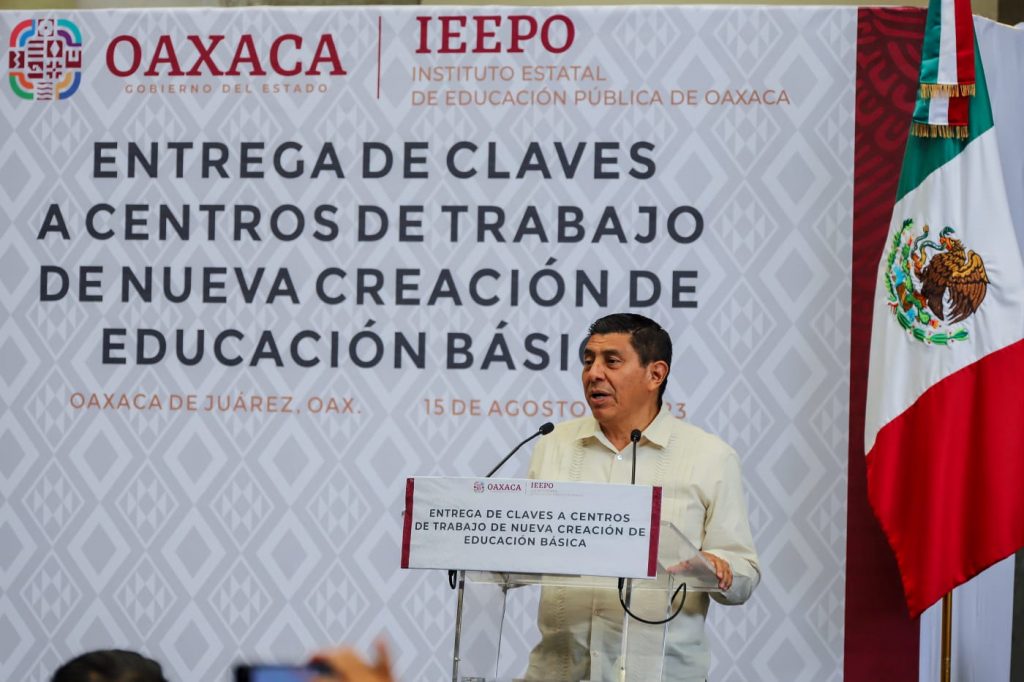 Es por ello, que, en esta entrega histórica, el Gobierno del Estado, a través del Instituto Estatal de Educación Pública de Oaxaca (IEEPO), cumple con la responsabilidad, previo al inicio del ciclo escolar 2023-2024, en otorgar 48 claves de Centros de Trabajo; 35 nuevas altas, siete reaperturas y seis cambios de domicilio, en beneficio de planteles de Educación Inicial Indígena, Preescolar General e Indígena, Primaria General e Indígena, Telesecundarias, Secundarias Técnicas y de Educación Especial.
