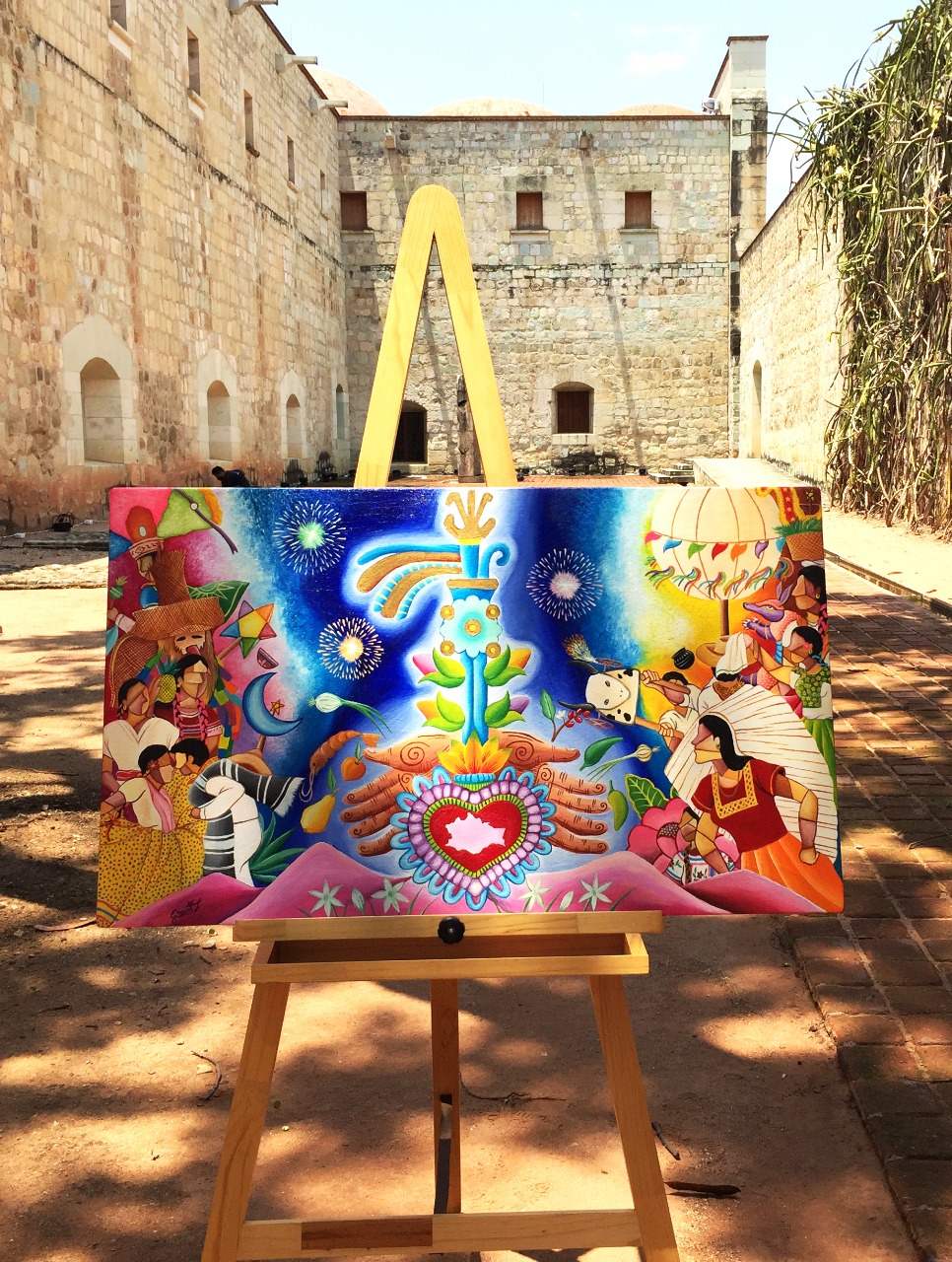 “El significado central de mi obra se enfoca en una sola cosa: Guendalizaa -cooperar-, una ofrenda de todas las regiones de nuestro estado entregada de todo corazón por las y los oaxaqueños, siendo ofrecida al país y al mundo entero”, señaló Erwis Félix Rodríguez Herrera autor de la obra ganadora realizada en óleo sobre lienzo.
