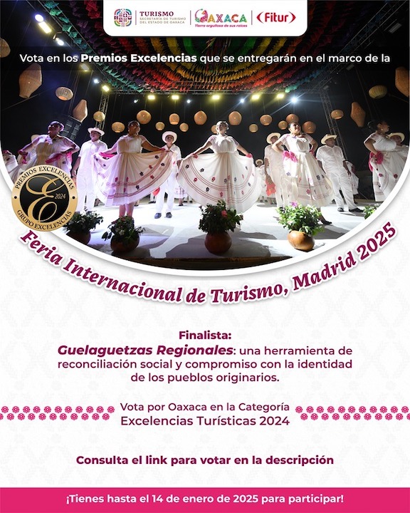 Oaxaca de Juárez, Oax, Oax. 14 de enero de 2025.- La Secretaría de Turismo del Estado (Sectur) invita a las y los oaxaqueños a participar en la votación de los Premios Excelencias 2024, en el que las Guelaguetzas Regionales son parte del panel de finalistas.