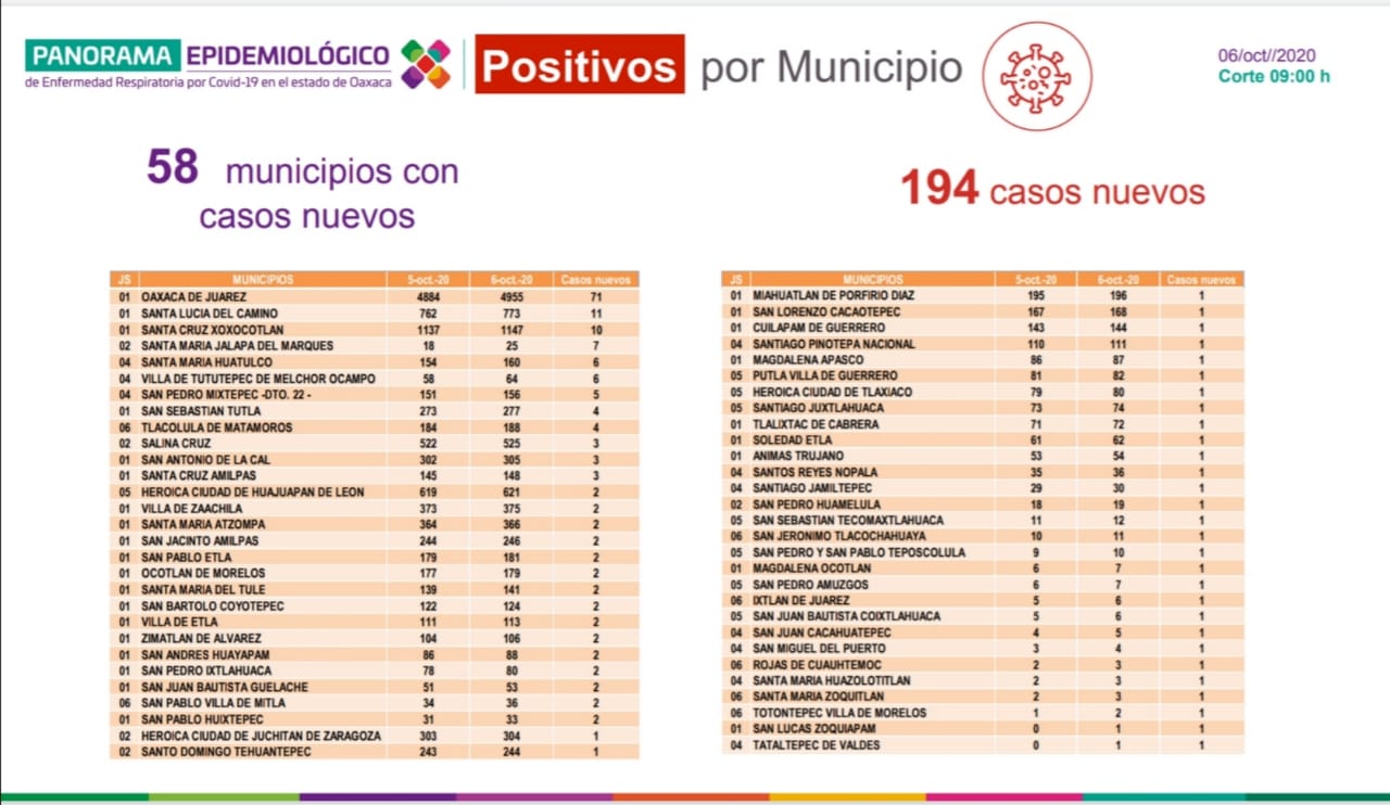 Especificó que los municipios que presentaron diagnósticos nuevos en las últimas 24 horas son principalmente: Oaxaca de Juárez con 71 casos, Santa Lucía del Camino con 11, Santa Cruz Xoxocotlán con 10, Santa María Jalapa del Marqués con siete, así como Santa María Huatulco y Villa de Tututepec de Melchor Ocampo con seis cada uno, por mencionar algunos.
