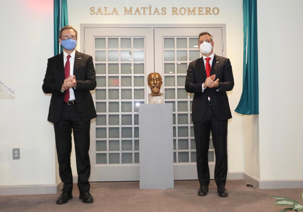 Washington, D.C. 26 de octubre de 2021. El gobernador Alejandro Murat Hinojosa y el embajador Esteban Moctezuma Barragán realizaron la develación del busto de Matías Romero Avendaño en la sede de la Embajada de México, con el objetivo de honrar al ilustre diplomático oaxaqueño quien fungió como embajador de nuestro país en los Estados Unidos de América durante el periodo del presidente Benito Juárez.