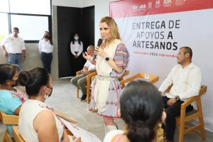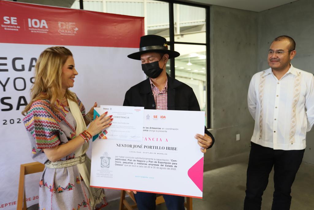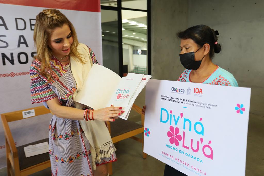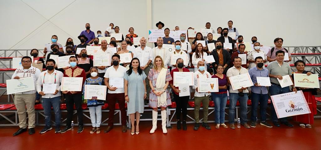 Gracias a estas acciones, la esposa del mandatario estatal, entregó a artesanas y artesanos de diferentes rubros, 54 títulos de registro de marca y constancias de varios cursos entre los que destacan, comercio exterior y ventas digitales, también manuales de identidad gráfica y 14 registros de certificación “Hecho en Oaxaca”.