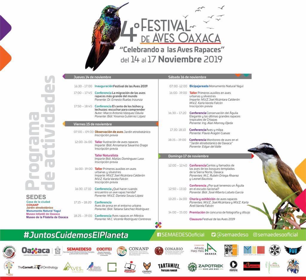 Durante los cuatro días de actividad se impartirán conferencias magistrales, observación de aves en el Jardín Etnobotánico de la capital oaxaqueña, talleres con temáticas que van desde ilustración de aves rapaces hasta brindar primeros auxilios a aves y una bicipajareada que arribará al Monumento Natural de Yagul.