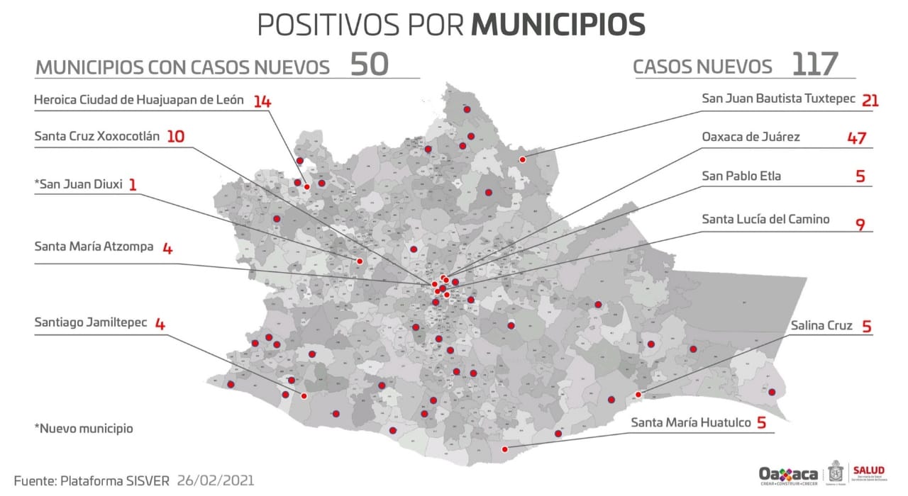 Enfatizó que los nuevos diagnósticos reportados en las últimas 24 horas se ubican en 50 municipios, entre los que sobresalen: Oaxaca de Juárez con 47, San Juan Bautista Tuxtepec con 21, Heroica Ciudad de Huajuapan de León con 14, Santa cruz Xoxocotlán con 10 y Santa Lucía del Camino con nueve; asimismo, por primera vez en la lista de ayuntamientos con contagios se notificó a San Juan Diuxi con un caso.