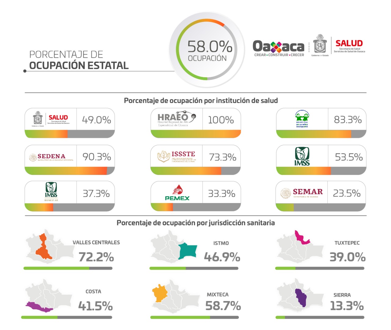 En cuanto a hospitalización a nivel estatal, el funcionario dijo que hay una ocupación del 58% en general; 12 nosocomios se encuentran al 100% en su capacidad de ingresos. Por Jurisdicción Sanitaria, Valles Centrales reportó una saturación de camas del 72.2%, Mixteca 58.7%, Istmo 46.9%, Costa 41.5%, Tuxtepec 39%, y Sierra 13.3%.