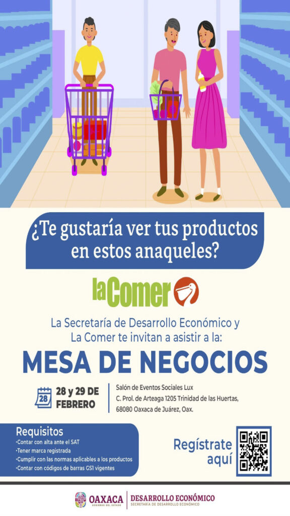 Oaxaca de Juárez, Oax. 21 de febrero de 2024.- Para fortalecer la presencia de productos oaxaqueños en el mercado nacional, la Secretaría de Desarrollo Económico (Sedeco) realizará mesas de negocios los días 28 y 29 de febrero, entre personas productoras locales y representantes de la cadena de tiendas de autoservicio La Comer.