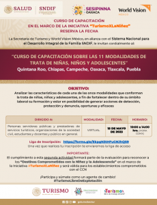 Por ello, invitó a personas servidoras públicas y prestadoras de servicios turísticos, organizaciones de la sociedad civil y público en general a participar en la capacitación “Sensibilización sobre trata y explotación de niñas, niños y adolescentes, un llamado a la acción desde el sector de los viajes y el turismo”, que será impartida en línea los días 12 de mayo de 11:00 a 13:00 y 15 de mayo de 10:00 a 14:00 horas.