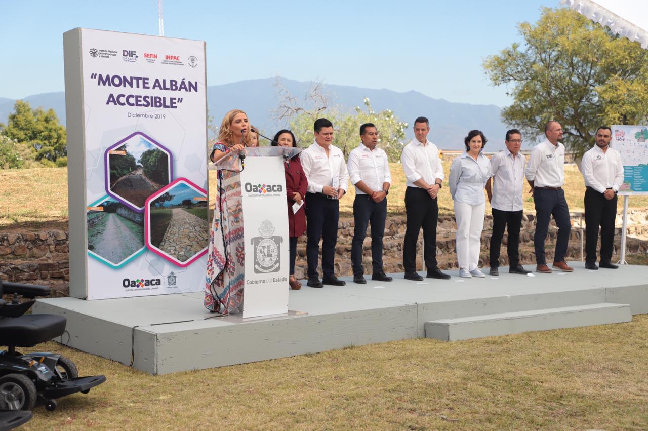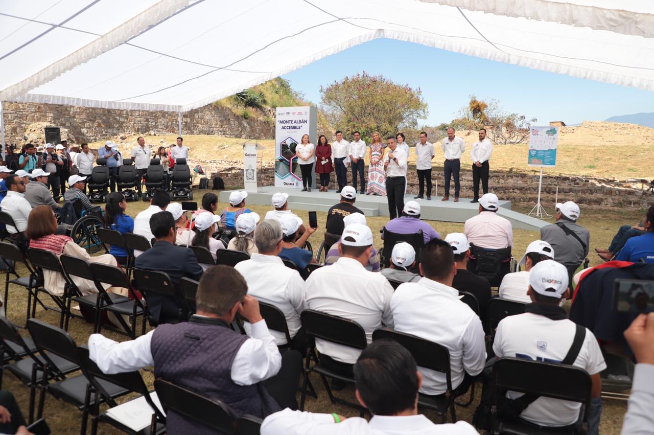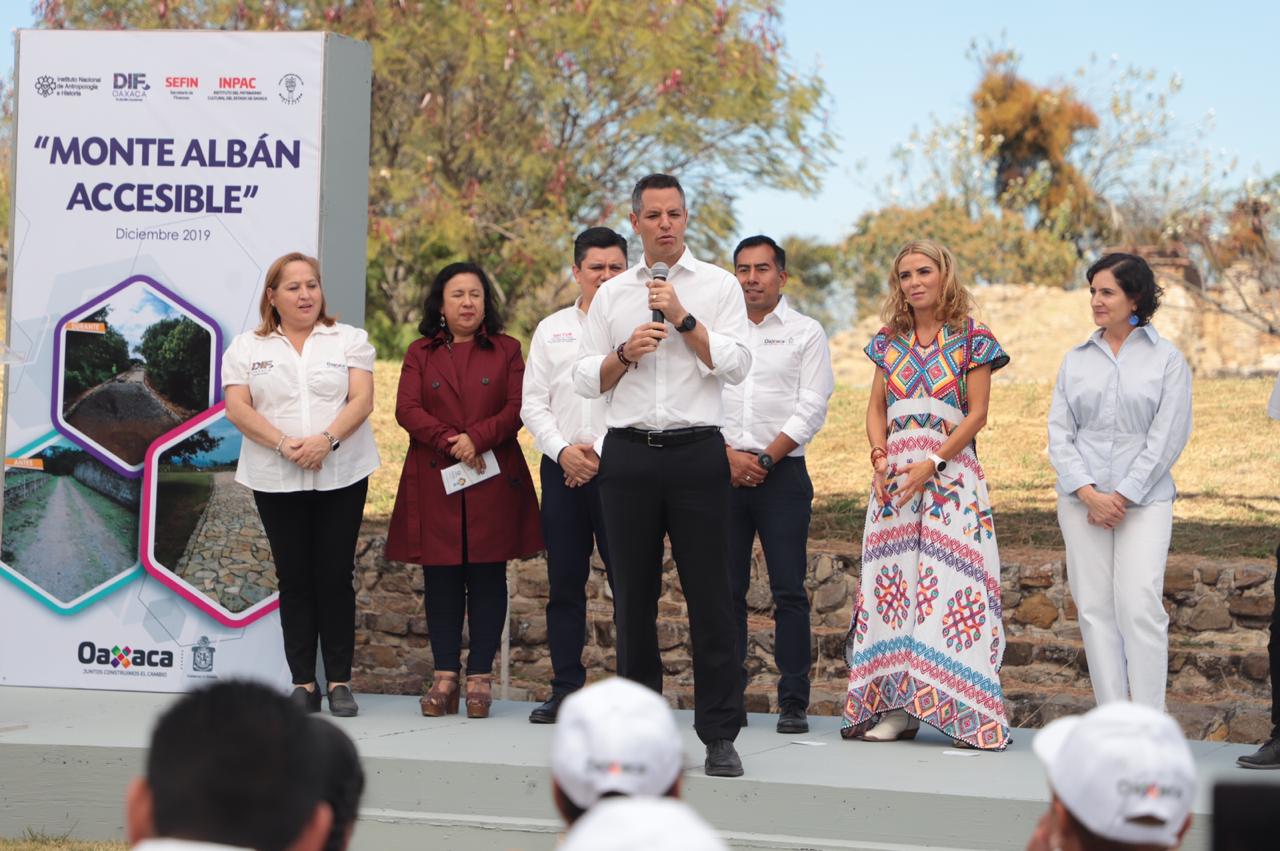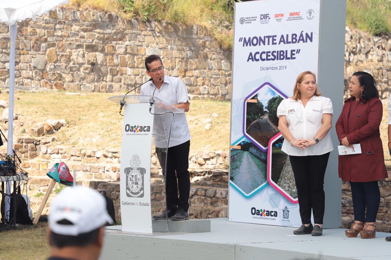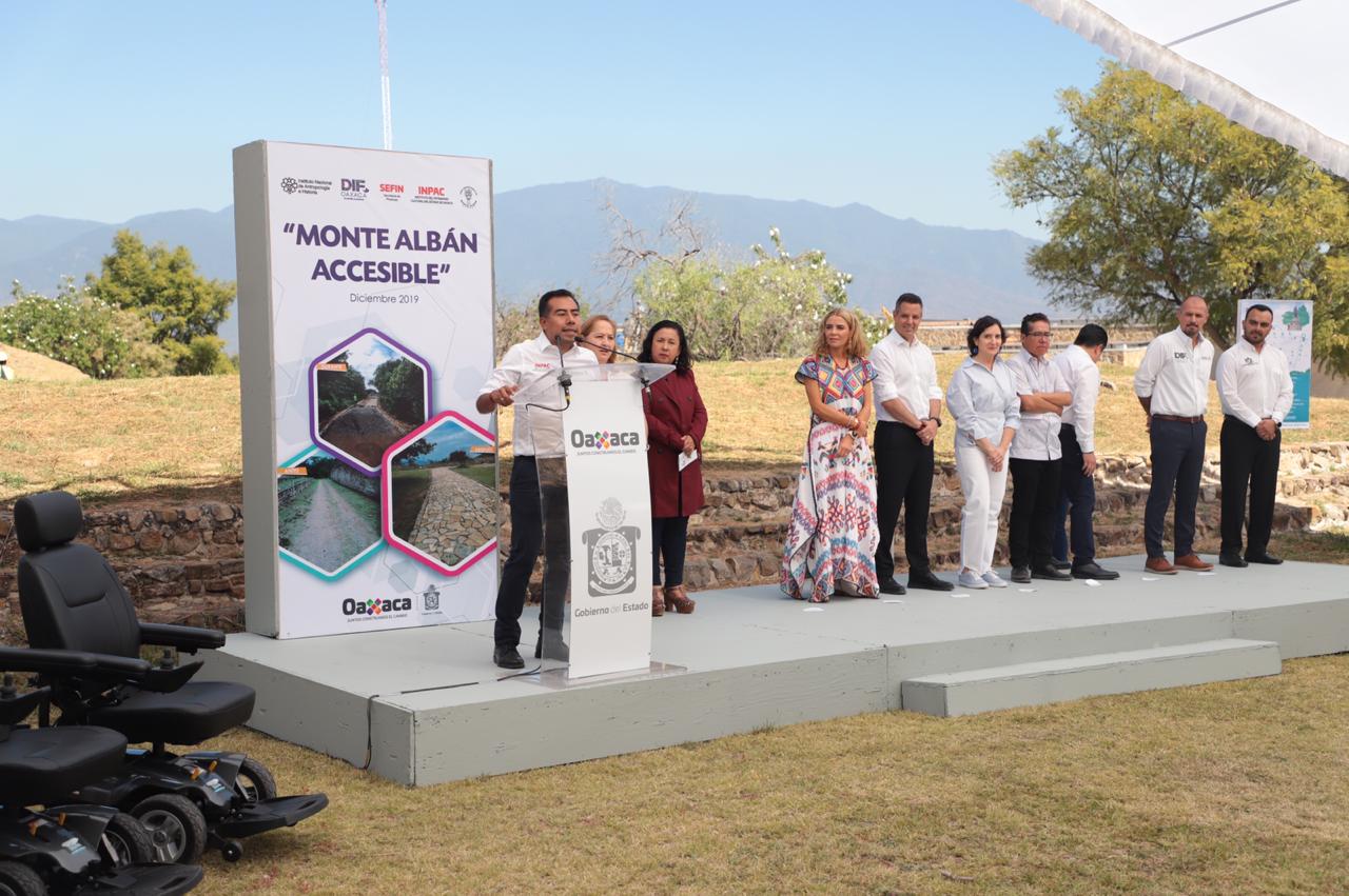 En el marco del Día Internacional de las Personas con Discapacidad -3 de diciembre- El Mandatario Estatal expuso que estas acciones tienen como finalidad lograr que Monte Albán sea un sitio incluyente, por lo que se elaboró el proyecto “Habilitación de acceso para las personas con discapacidad motriz”, derivado del taller “Monte Albán Accesible”, con la participación de especialista y personal del DIF Oaxaca.