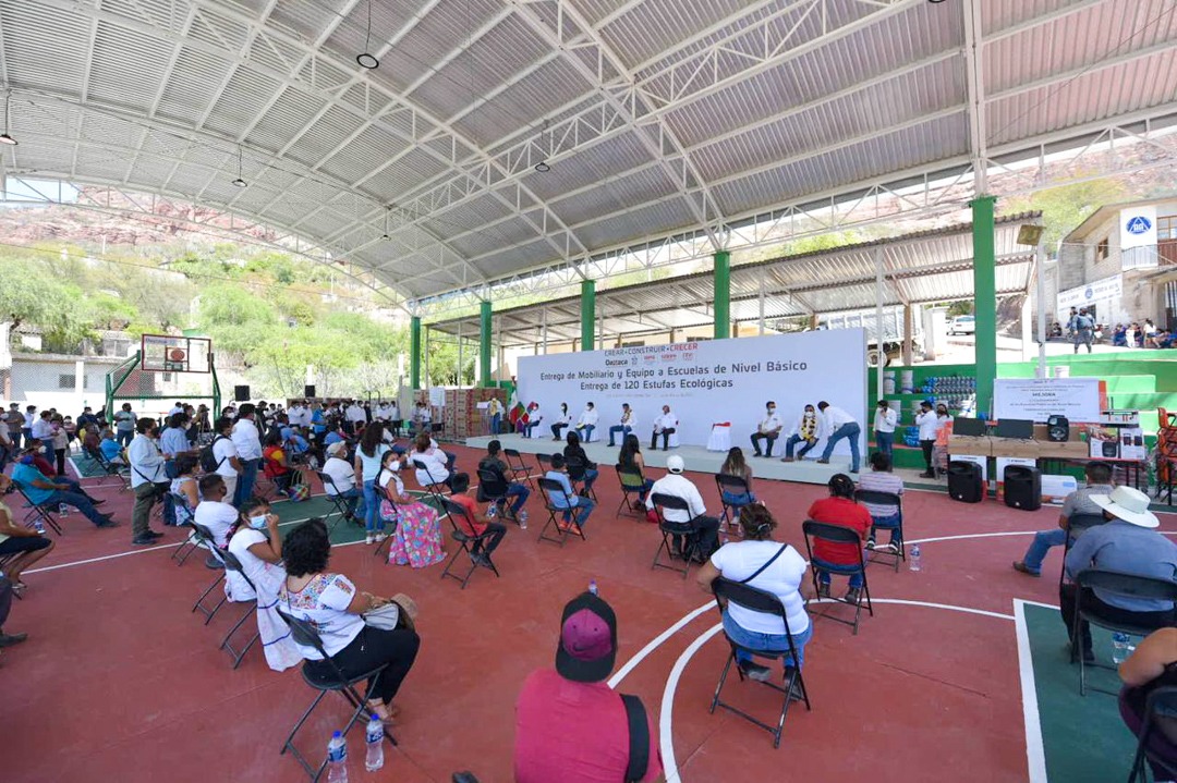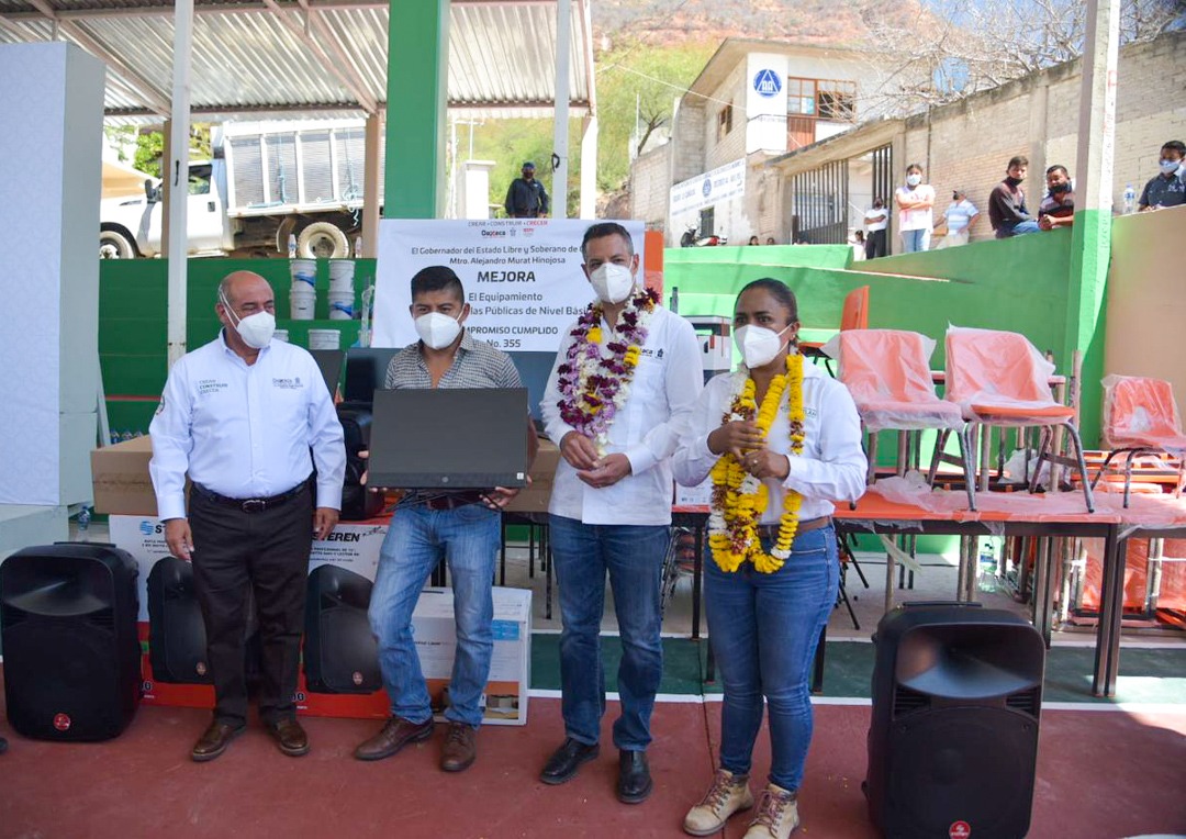 Posteriormente, con el objetivo de contribuir al desarrollo integral de las niñas y los niños, el gobernador Alejandro Murat Hinojosa, realizó la entrega de mobiliario y equipo para 26 escuelas de nivel básico de la región de la Cañada, beneficiando de esa manera a más de mil 600 estudiantes y docentes; cabe señalar que esta acción representa el compromiso cumplido número 355 de esta administración.