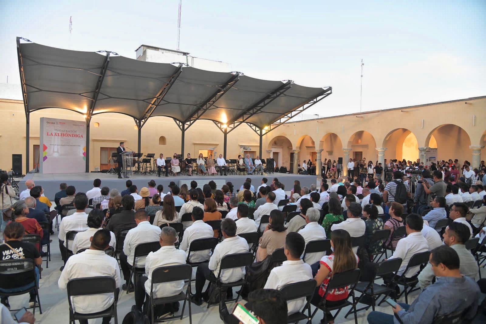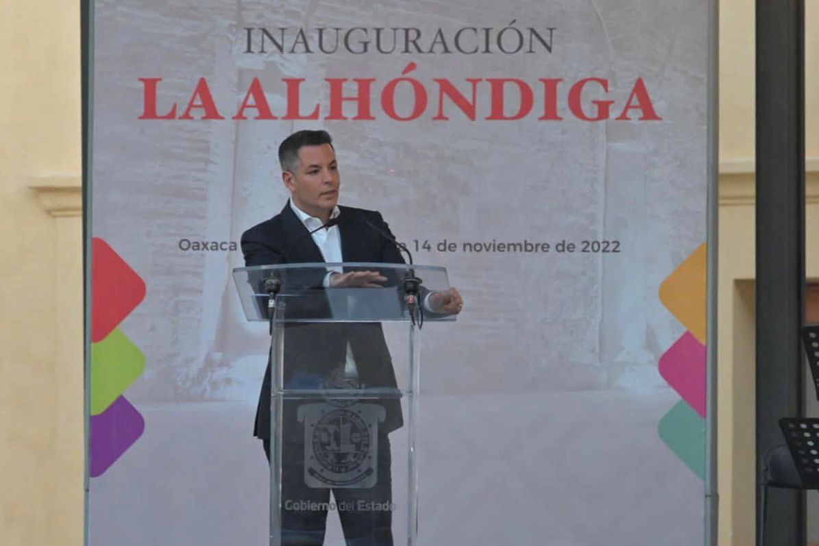 Oaxaca de Juárez, Oax. 14 de noviembre de 2022.- Con una inversión de 30 millones de pesos, el gobernador Alejandro Murat Hinojosa, inauguró las nuevas instalaciones de la Real Alhóndiga de Antequera, un inmueble que data de mediados del siglo XVIII y es un recuerdo vivo del Oaxaca prehispánico y de la vieja Antequera virreinal, en cuyo suelo están los vestigios de la casa y el templo del mayordomo de Moctezuma Xocoyotzin, así como las huellas de la llamada Casa de Cortés.