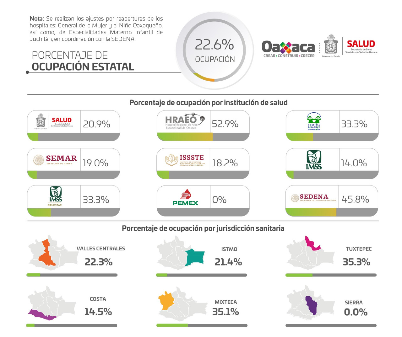Hay cuatro nosocomios que se encuentra al 100% de saturación médica. Por Jurisdicción Sanitaria: Valles Centrales registra 22.3%, Istmo 21.4%, Tuxtepec 35.3%, Costa 14.5%, Mixteca 35.1% y la Sierra no presenta pacientes hospitalizados.