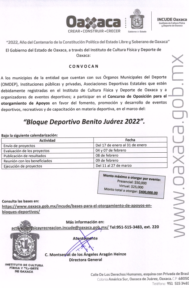 Para las y los interesados, la convocatoria completa la podrá revisar en la página de internet oficial del Incude Oaxaca: https://www.oaxaca.gob.mx/incude/bases-para-el-otorgamiento-de-apoyos-en-bloques-deportivos/
