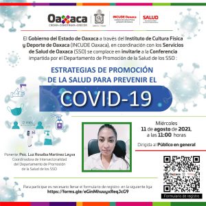 Oaxaca de Juárez, Oax. 10 de agosto de 2021.- El Instituto de Cultura Física y Deporte de Oaxaca (Incude Oaxaca), en coordinación con los Servicios de Salud de Oaxaca (SSO), realizarán la conferencia Estrategias de Promoción de la Salud para prevenir el COVID-19.