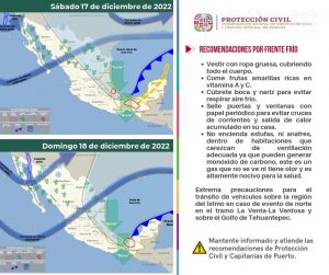 Señaló que para este sábado y domingo, se presentará evento de norte moderado en el oriente del Istmo de Tehuantepec, acompañado de aportaciones mayores de aire frío que pueden fortalecer la sensación fresca a fría y que abrirán el riesgo de heladas nuevamente.