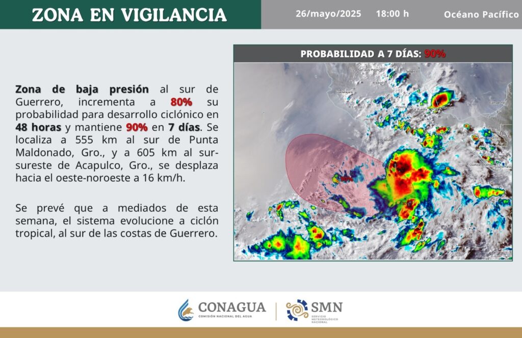 Oaxaca de Juárez, Oax. 26 de mayo de 2025.- La Coordinación Estatal de Protección Civil y Gestión de Riesgos (CEPCyGR) informa que, una zona de baja presión localizada al sur de las costas de Guerrero ha incrementado su probabilidad de desarrollo ciclónico a 80 por ciento en las próximas 48 horas y aumenta a un 90 por ciento en los próximos 7 días.