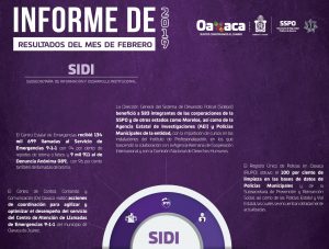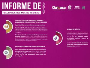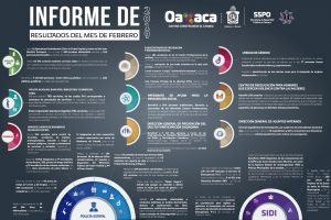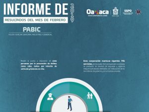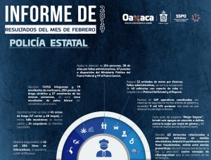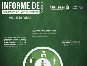 Oaxaca de Juárez, Oax. 01 de marzo de 2019. Las corporaciones y áreas que integran la Secretaría de Seguridad Pública de Oaxaca (SSPO) mantienen vigentes los trabajos para coadyuvar en la prevención social del delito que, de la mano con las estrategias operativas desplegadas en la entidad, mostraron los siguientes resultados durante el mes de febrero.