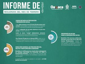 Así también, en colaboración con la Unidad Municipal de Reeducación de San Pedro y San Pablo Teposcolula, se integraron a 20 adolescentes al programa Convivencias sin violencia, 300 personas fueron sensibilizadas en diversos temas preventivos y 740 personas más, atendidas en los espacios y programas reeducativos.