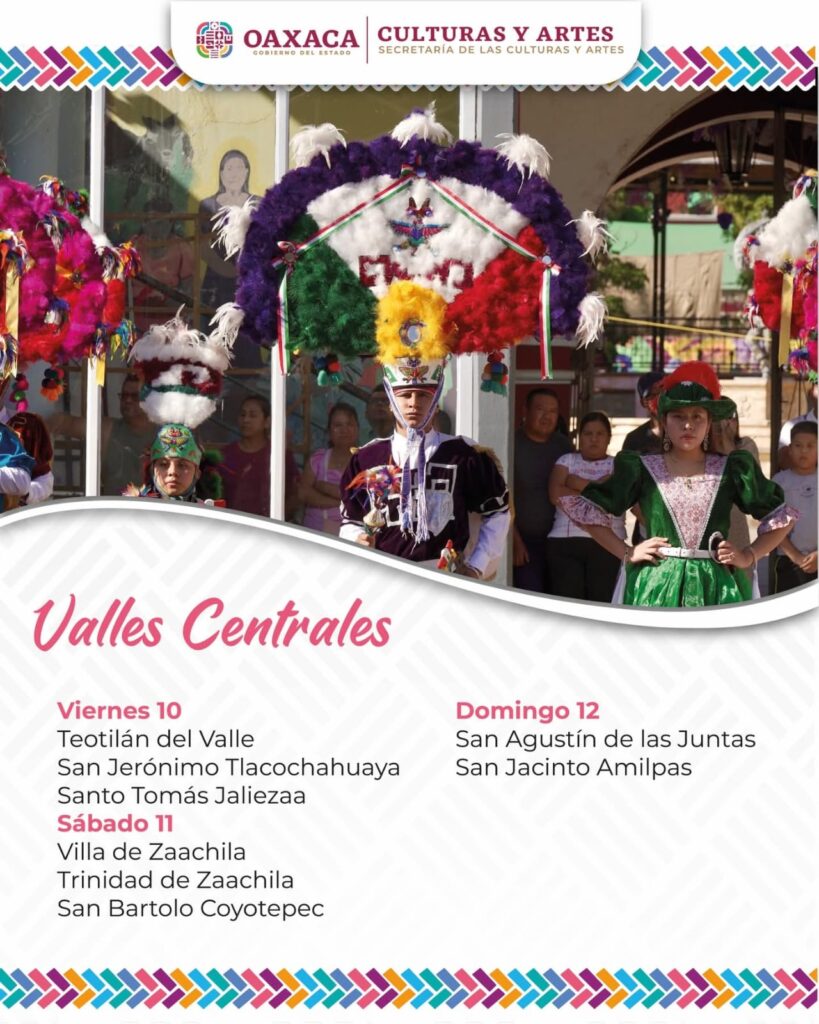Finalmente, en los Valles Centrales, se recorrerán Teotitlán del Valle, San Jerónimo Tlacochahuaya, Santo Tomás Jalieza, Villa de Zaachila, Trinidad Zaachila, San Bartolo Coyotepec, San Agustín de las Juntas y San Jacinto Amilpas.