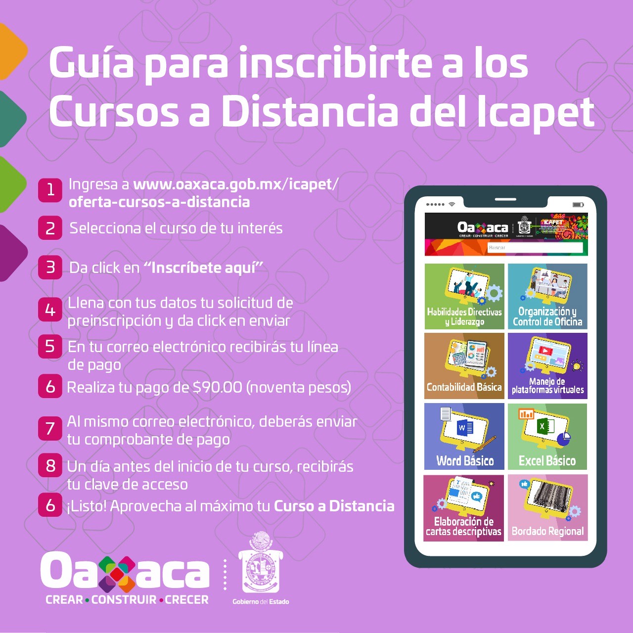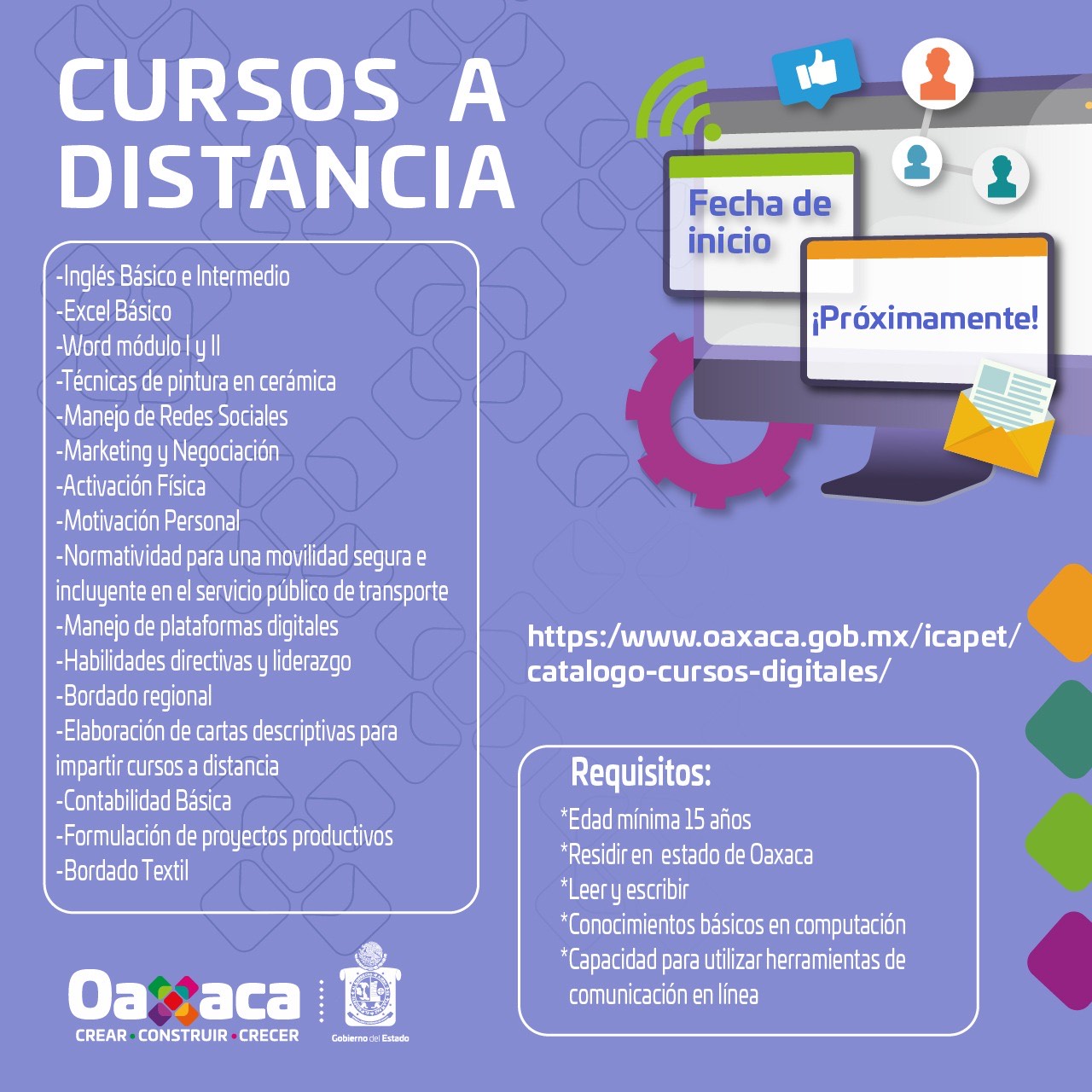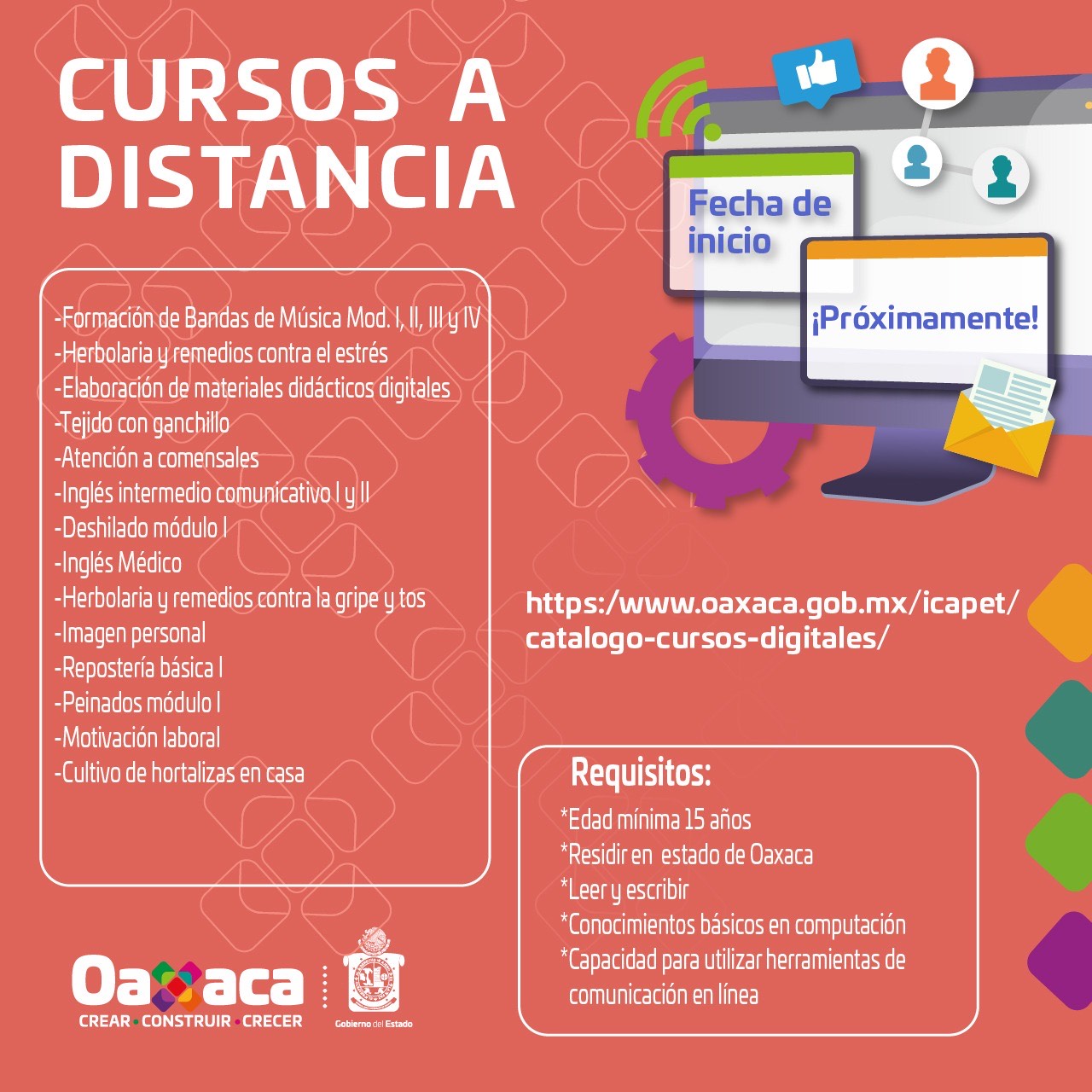 La oferta educativa y requisitos pueden ser consultados en www.oaxaca.gob.mx/icapet/oferta-cursos-a-distancia, mientras que los cursos que estarán disponibles a lo largo del 2021, pueden ser consultados en www.oaxaca.gob.mx/icapet/catalogo-cursos-digitales.