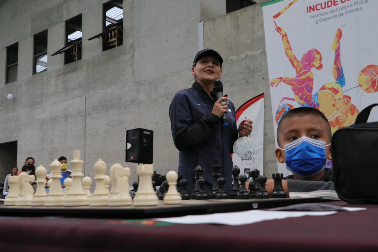 • La titular del Incude Oaxaca, Montserrat de los Ángeles Aragón Heinze hizo la declaratoria inaugural y el primer movimiento sobre el tablero