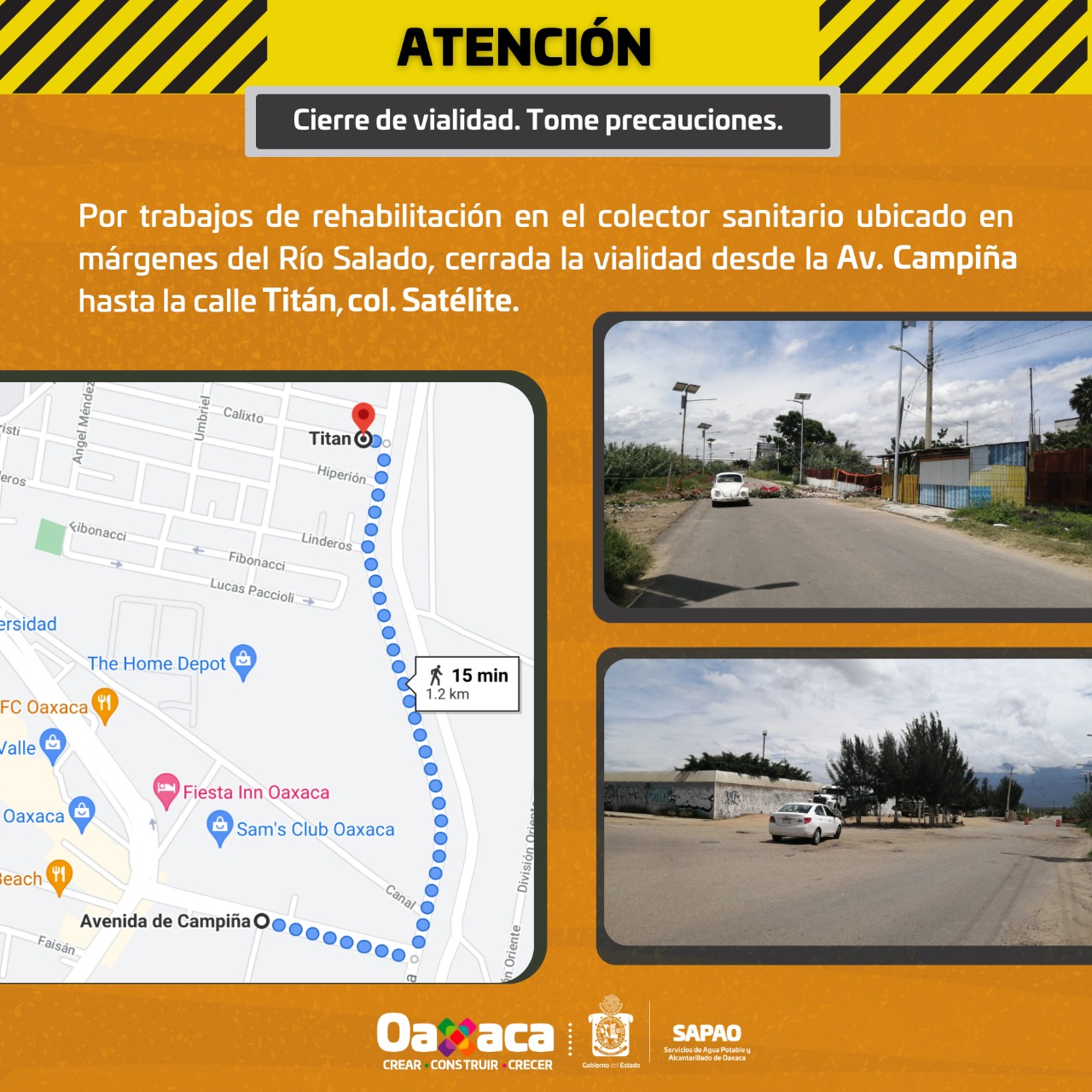 - Cerrada circulación vial en el tramo de calle Titán hasta Avenida la Campiña, esquina río Salado