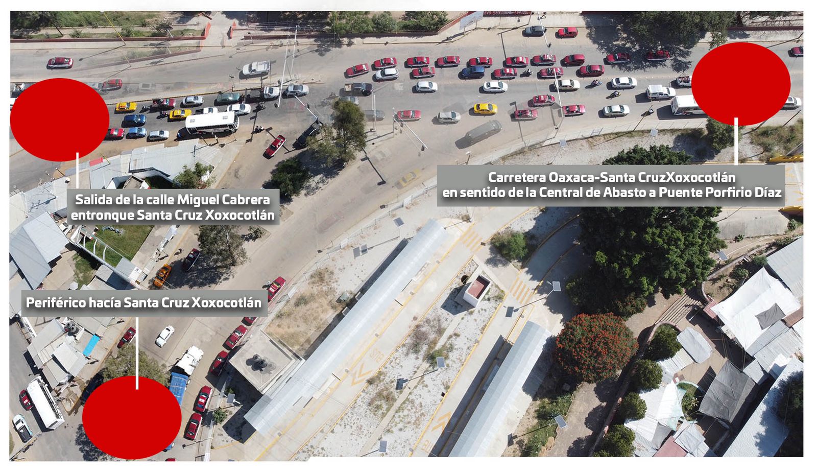 Carretera Oaxaca – Santa Cruz Xoxocotlán en sentido de la Central de Abasto a Puente Porfirio Díaz; la Salida de la calle Miguel Cabrera – entronque Santa Cruz Xoxocotlán; y el Periférico hacia Santa Cruz Xoxocotlán, en ambos sentidos.