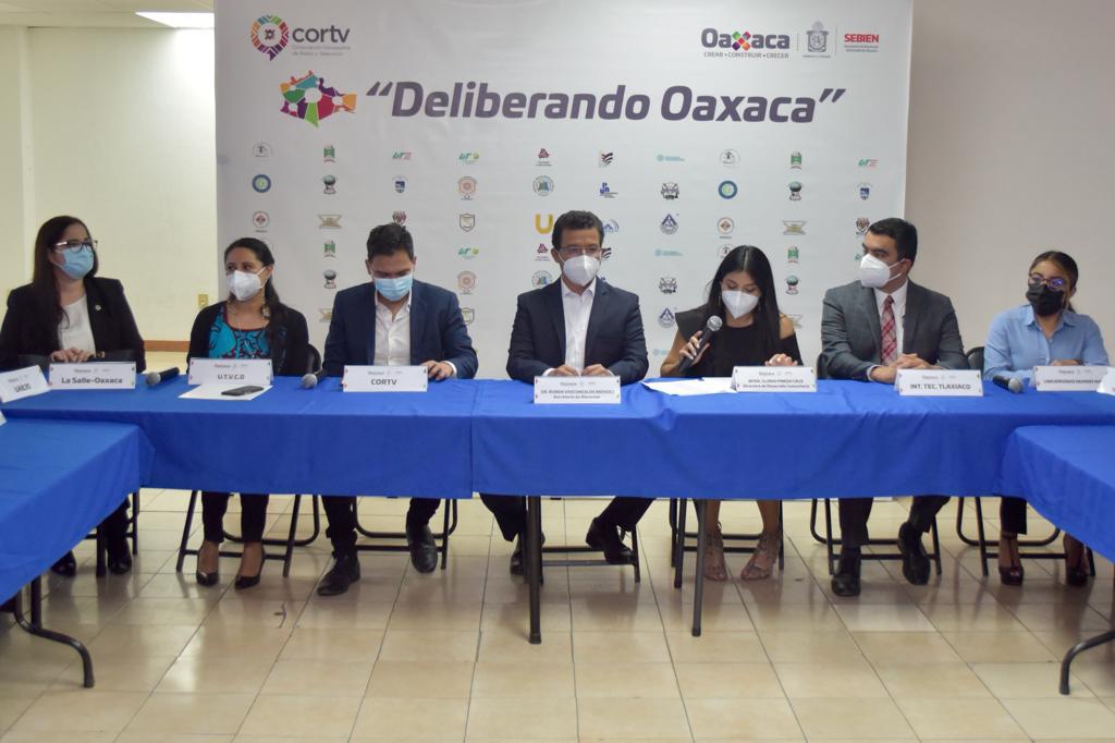 Oaxaca de Juárez, Oax. 19 de noviembre de 2021.- En una iniciativa conjunta entre la Secretaría de Bienestar del Gobierno del Estado (Sebien) y la Corporación Oaxaqueña de Radio y Televisión (Cortv) en alianza con 21 universidades e instituciones de educación superior del estado, el secretario de Bienestar, Rubén Vasconcelos Méndez, anunció el inicio del Proyecto “Deliberando”, teniendo como primer componente el arranque de un programa de televisión, que se transmitirá a partir del 23 de noviembre, a través de la señal de la Cortv.
