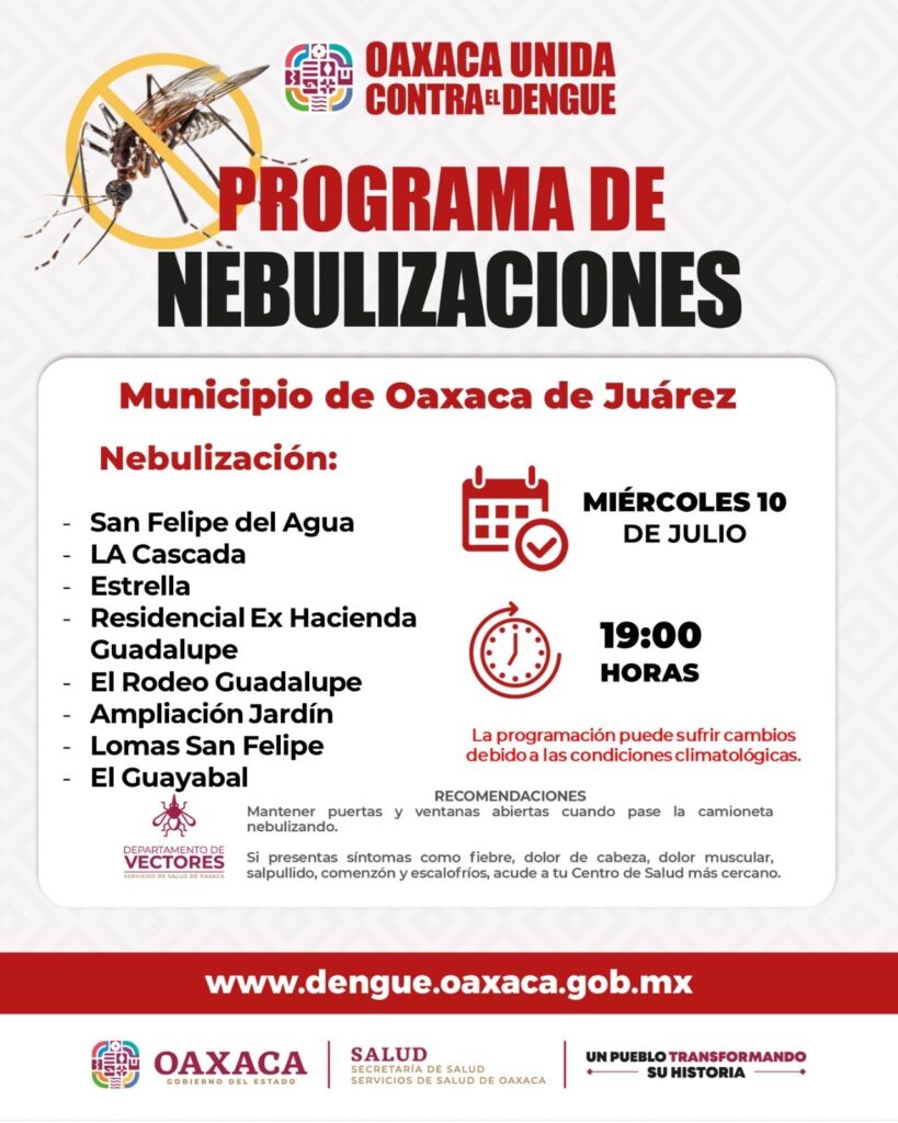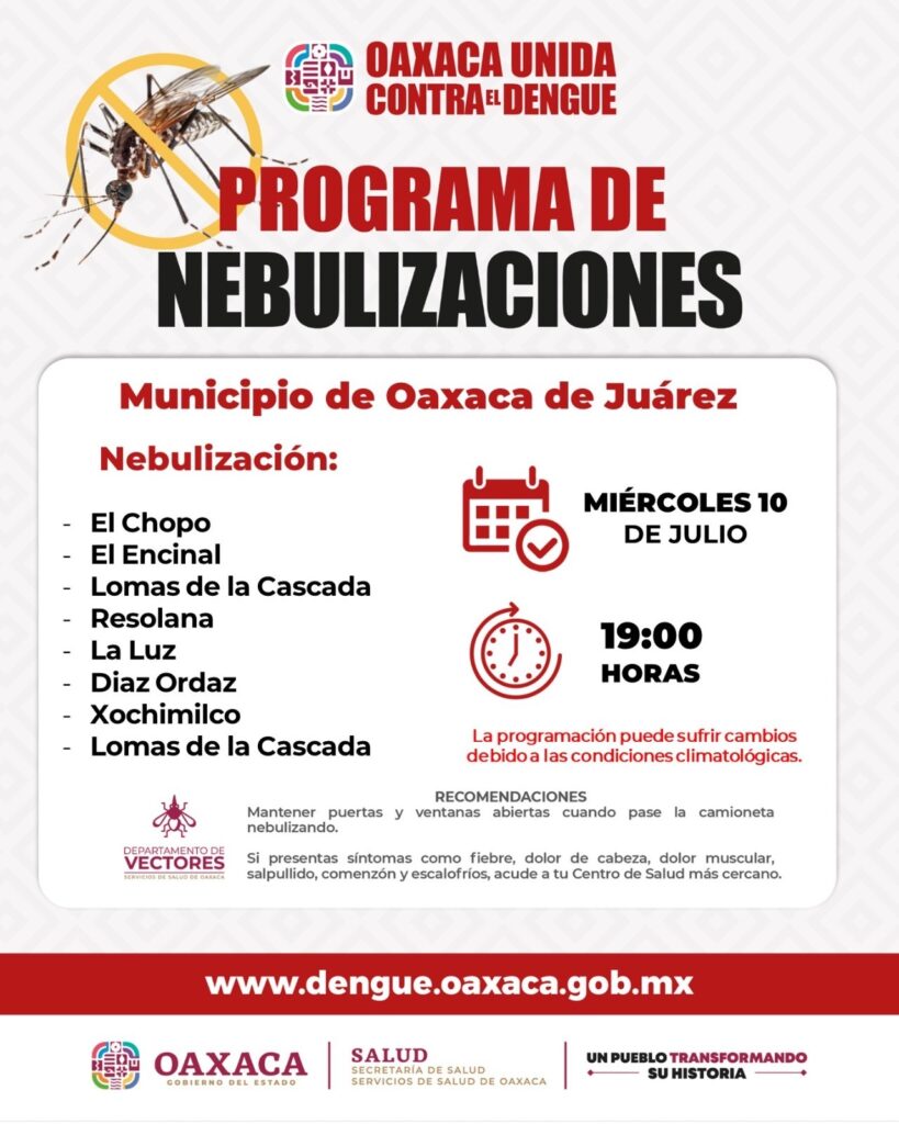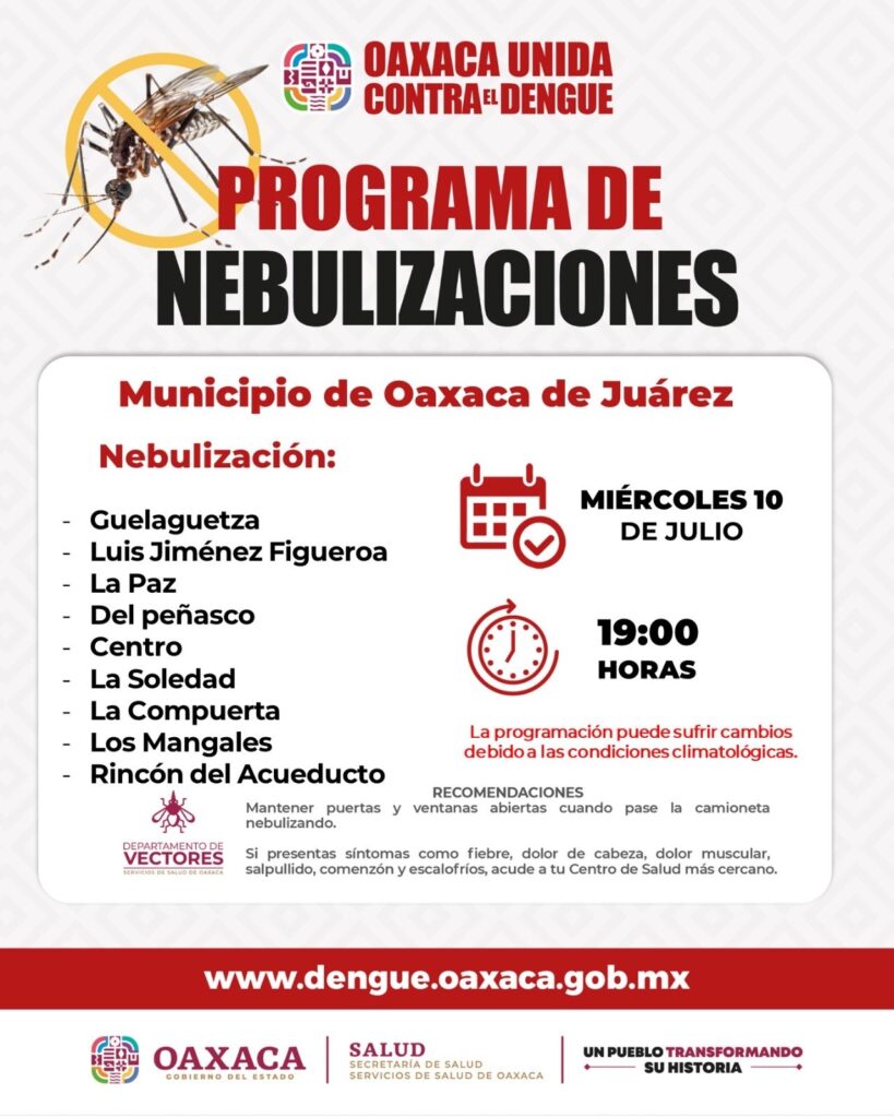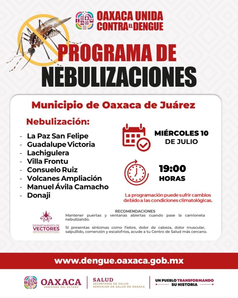 La programación de las nebulizaciones está sujeta a las condiciones climáticas, por lo que en caso de lluvia y fuertes vientos, la estrategia se reprogramará en las madrugadas, detalló durante el corte informativo de dengue que se transmite por la Corporación Oaxaqueña de Radio y Televisión (CORTV), la jefa del departamento de urgencias epidemiológicas y desastres, Adriana Jarquín González.