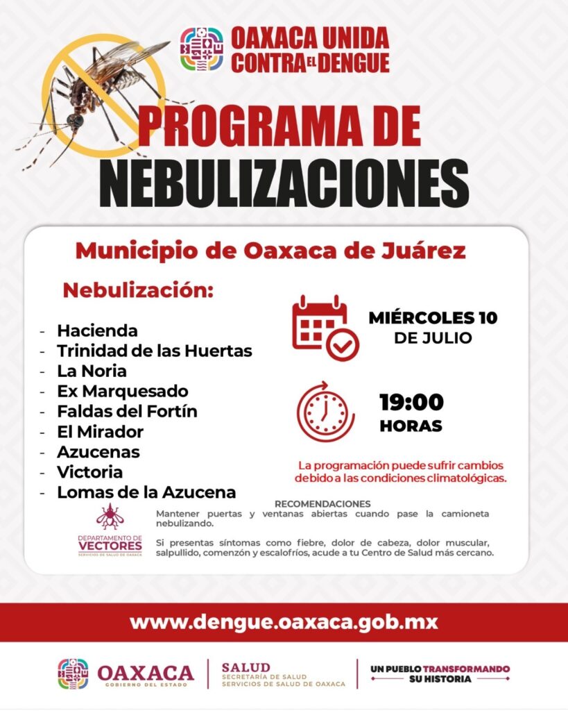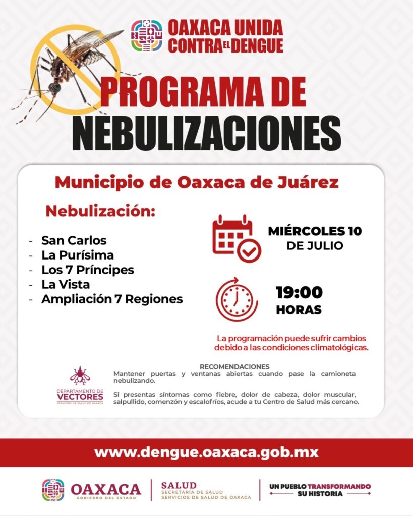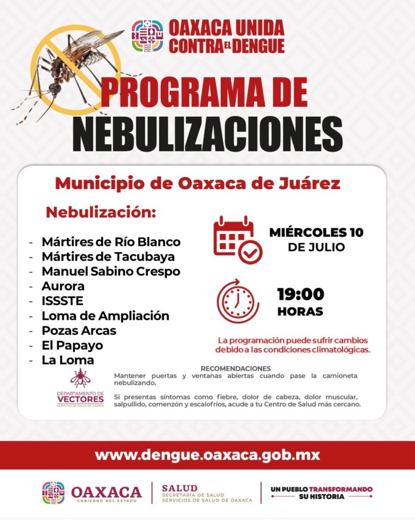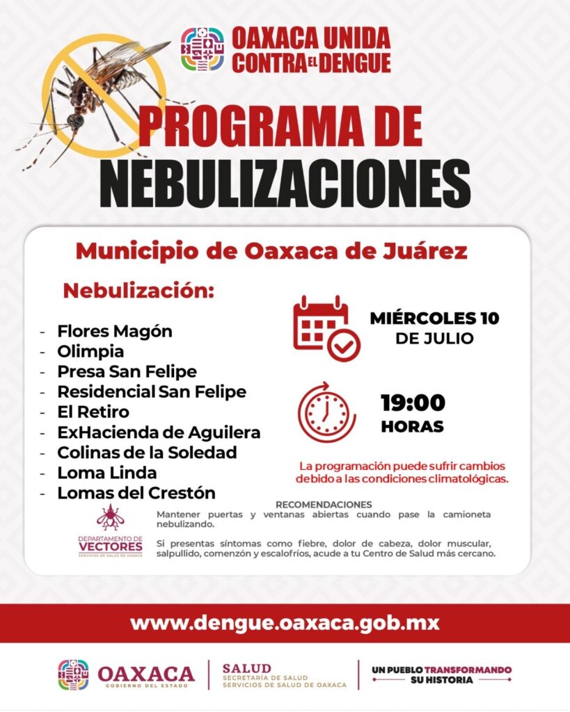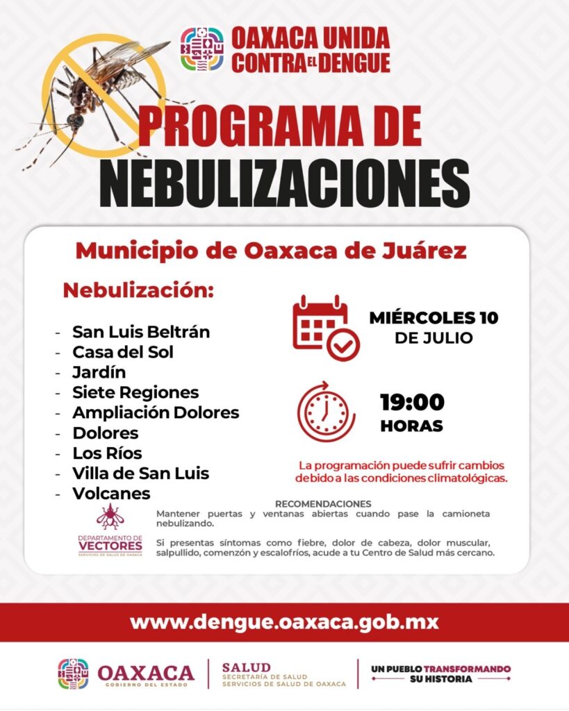 La programación de las nebulizaciones está sujeta a las condiciones climáticas, por lo que en caso de lluvia y fuertes vientos, la estrategia se reprogramará en las madrugadas, detalló durante el corte informativo de dengue que se transmite por la Corporación Oaxaqueña de Radio y Televisión (CORTV), la jefa del departamento de urgencias epidemiológicas y desastres, Adriana Jarquín González.
