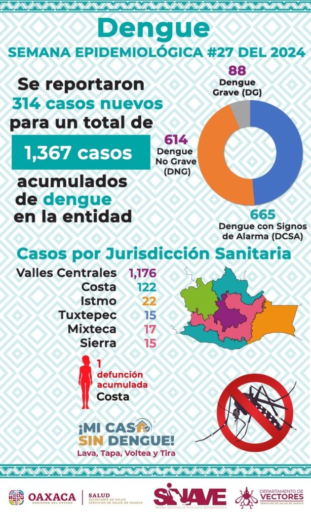 Agregó que, del total de casos por Jurisdicción Sanitaria, Valles Centrales acumula mil 176 casos, la Costa 122, Istmo 22, Mixteca 17, Tuxtepec 15 e igual número en la Sierra.
