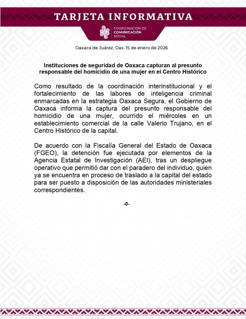 Como resultado de la coordinación interinstitucional y el fortalecimiento de las labores de inteligencia criminal enmarcadas en la estrategia Oaxaca Segura, el Gobierno de Oaxaca informa la captura del presunto responsable del homicidio de una mujer, ocurrido el miércoles en un establecimiento comercial de la calle Valerio Trujano, en el Centro Histórico de la capital.