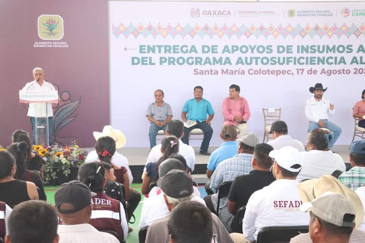 Santa María Colotepec, Oax. 17 de agosto de 2024.- Con el objetivo de incrementar la producción de maíz, granos básicos e impulsar el sector pesquero en Santa María Colotepec, el Gobierno de Oaxaca a través de la Secretaría de Fomento Agroalimentario y Desarrollo Rural (Sefader) realizó la entrega de insumos del programa Autosuficiencia Alimentaria.