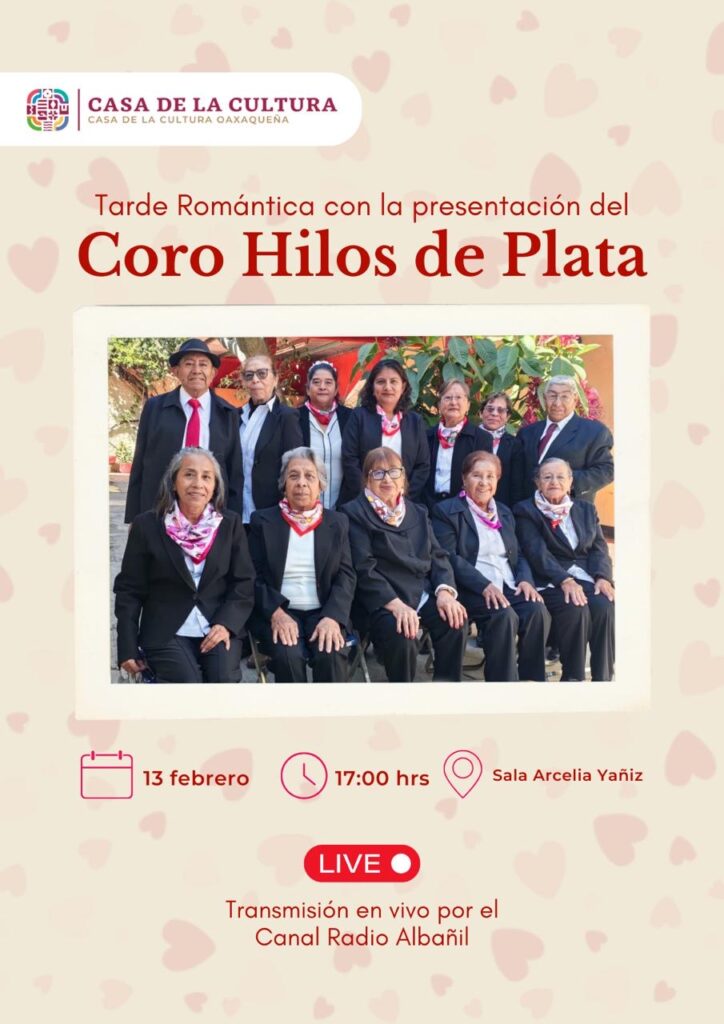 El viernes 13, a las 17:00 horas, será una tarde romántica con la presentación del Grupo de Coro Hilos de Plata de Adultos Mayores de la CCO, quienes amenizarán con temas referentes al mes del amor y la amistad.