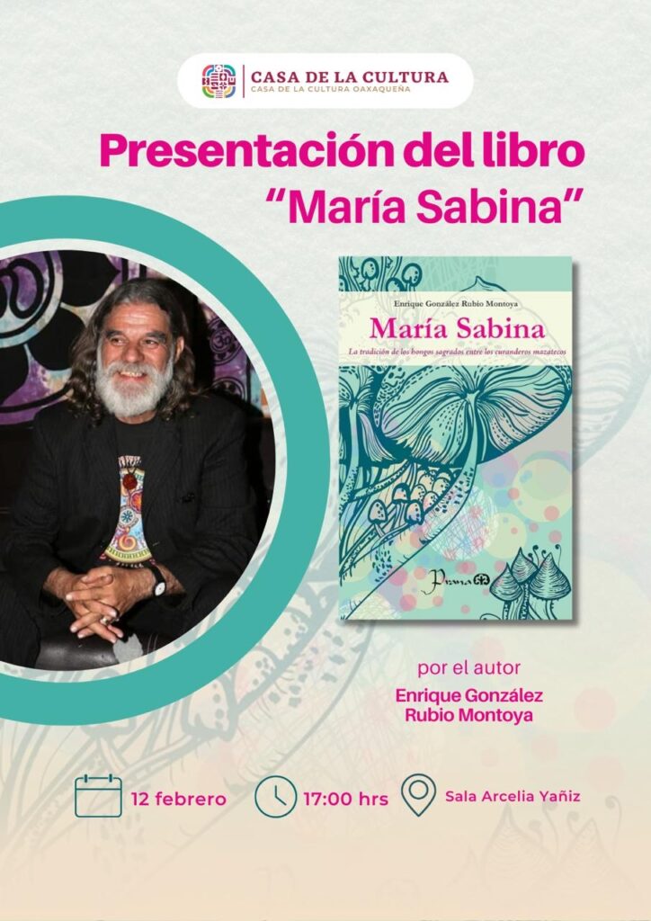 En este mismo foro, el jueves 12, a las 17:00 horas, se presentará el libro “María Sabina” por el autor Enrique González Rubio Montoya, cuya obra expone la vida de la famosa curandera mazateca y el uso ceremonial de los hongos. Combina investigaciones personales y experiencias con esta tradición.