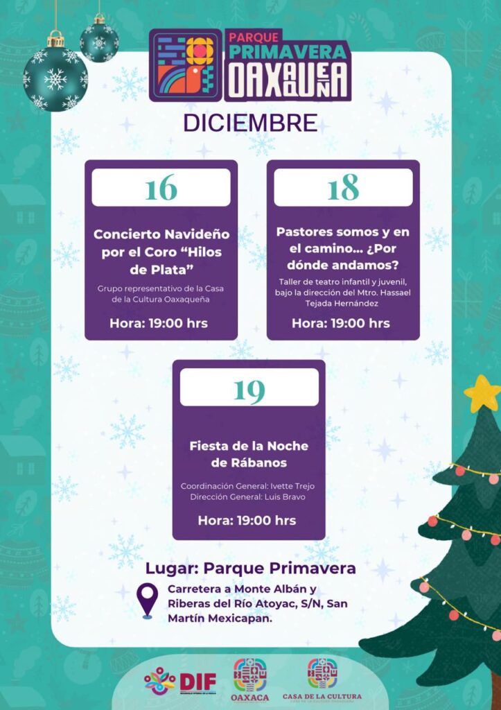 Por otra parte, a lo largo de tres días, albergará la alegría a partir de las 19:00 horas en el Parque Primavera Oaxaqueña Cho Ndobá. El 16 de diciembre se ofrecerá un concierto navideño a cargo del coro Hilos de Plata; el 18 de este mes se pondrá a disposición el taller de teatro infantil y juvenil “Pastores somos y en el camino… ¿Por dónde andamos?” y concluirá esta jornada el 19, con la Fiesta de la Noche de Rábanos.