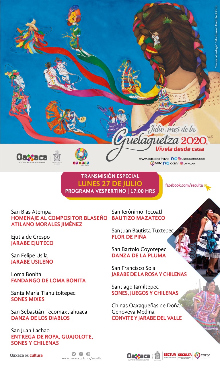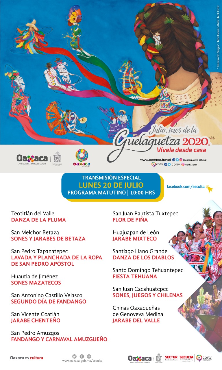 Oaxaca de Juárez, Oax. 16 de julio de 2020.- El Gobierno del Estado a través de la Secretaría de Turismo (Sectur Oaxaca), la Secretaría de Economía (SE) y la Secretaría de las Culturas y Artes de Oaxaca (Seculta), invitan a las y los oaxaqueños a disfrutar de manera virtual de la máxima fiesta del estado, “La Guelaguetza 2020”.