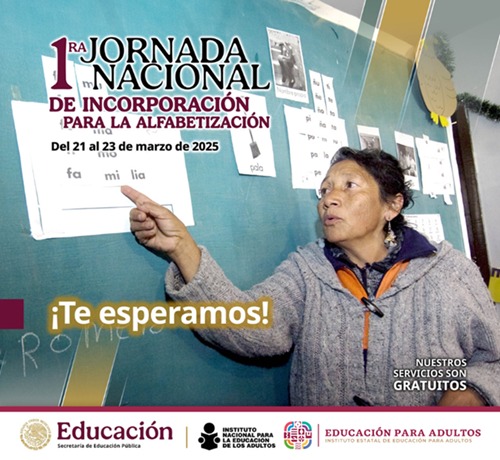 Oaxaca de Juárez, Oax. 20 de marzo de 2025.- El Instituto Estatal de Educación para Adultos (IEEA) invita a las personas jóvenes y adultas que deseen aprender a leer y escribir, a participar en la Primera Jornada Nacional de Incorporación para la Alfabetización, que se llevará a cabo del 21 al 23 de marzo.