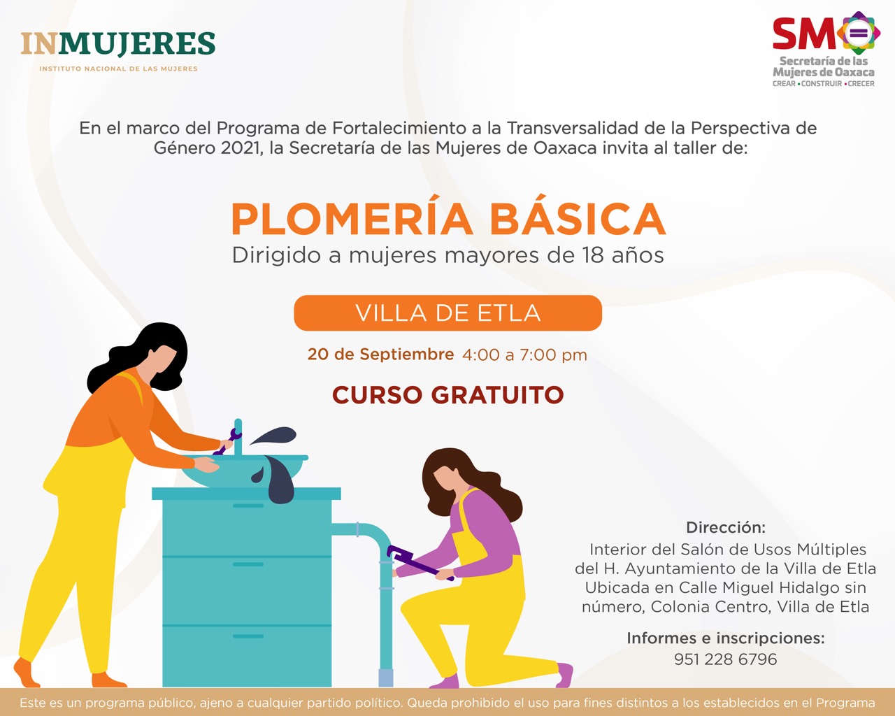 Oaxaca de Juárez, Oax., 19 de septiembre de 2021.- La Secretaría de las Mujeres de Oaxaca (SMO) junto con la Federación, a través del Instituto Nacional de las Mujeres (INM) y las respectivas Instancias Municipales de las Mujeres, invita a participar en los cursos presenciales sobre oficios no tradicionales como Plomería Básica y Mecánica para mujeres, los días 20 y 21 y 27 y 28 de este mes respectivamente, en municipios como Villa de Etla, San Jacinto Amilpas, Santa María El Tule, entre otros.