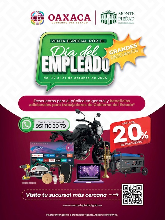 Oaxaca de Juárez, Oax. 21 de octubre de 2025.- El Monte de Piedad del Estado de Oaxaca realizará su venta especial por el Día del Empleado, del 22 al 31 de octubre en todas sus sucursales de la entidad; a fin de reconocer la confianza y preferencia de las y los clientes de la institución.