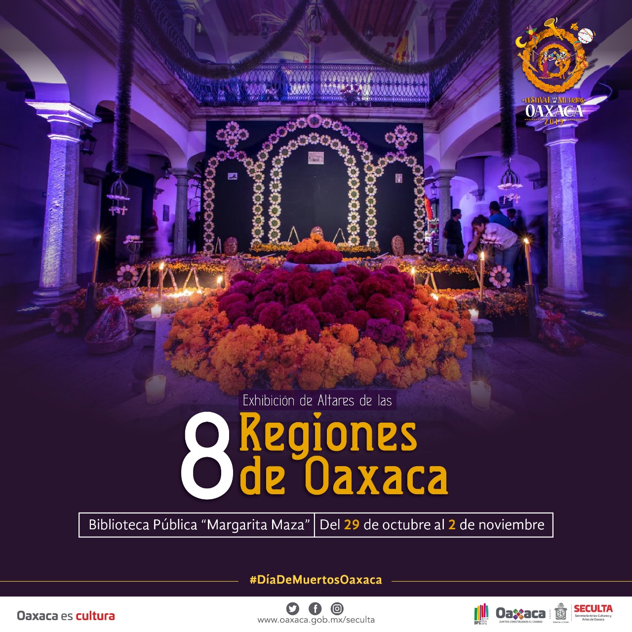 Oaxaca de Juárez, Oax. 29 de octubre de 2019.- La Secretaría de las Culturas y Artes de Oaxaca (Seculta), invita a la ciudadanía oaxaqueña y visitantes a la inauguración de la Exhibición de Altares de las 8 regiones de Oaxaca a realizarse el martes 29 de octubre a las 19:00 horas en la Biblioteca Pública Central (BPC) “Margarita Maza de Juárez”, y cuya entrada es libre.