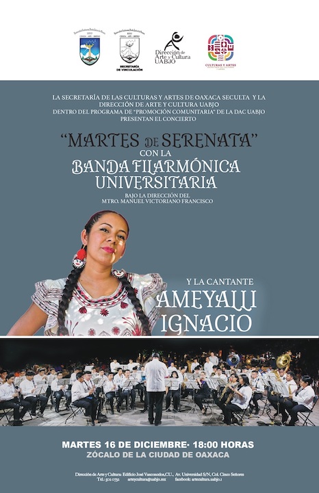 A las 18:00 horas se realizará el concierto “Martes de Serenata”, con la participación de la Banda Filarmónica Universitaria, dirigida por el maestro Manuel Victoriano Francisco y la cantante oaxaqueña Ameyalli Ignacio, reconocida por su labor en la difusión de la música tradicional.