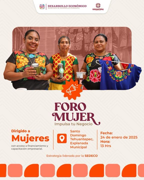 Oaxaca de Juárez, Oax. 16 de enero de 2025.- La Secretaría de Desarrollo Económico (Sedeco) invita a emprendedoras a participar en los foros Mujer Impulsa tu Negocio, que iniciarán el 24 de enero en Juchitán de Zaragoza y Santo Domingo Tehuantepec, a través de los cuales, alrededor de mil participantes recibirán capacitación para potenciar sus ventas, orientación sobre acceso a financiamiento preferencial y presencia en mercados nacionales.