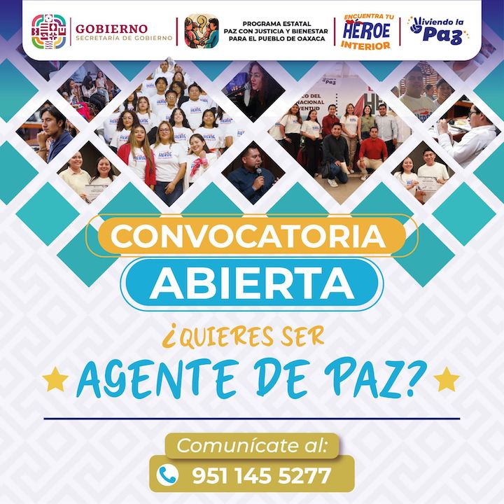 Oaxaca de Juárez, Oax. 9 de octubre de 2025.- La Secretaría de Gobierno del Estado de Oaxaca (Sego) lanza la segunda convocatoria del programa “Agentes de Paz”, dirigida a las juventudes oaxaqueñas comprometidas con la transformación social y la construcción de entornos más armónicos.