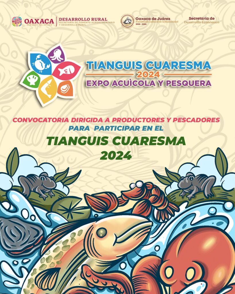 Oaxaca de Juárez, Oax. 24 de enero de 2024.- La Secretaría de Fomento Agroalimentario y Desarrollo Rural (Sefader) del Gobierno del Estado y la Secretaría de Desarrollo Económico del municipio de Oaxaca de Juárez, invitan a las y los productores acuícolas y pesqueros a participar en el Tianguis Cuaresma 2024 para exponer y vender sus productos frescos o preparados.