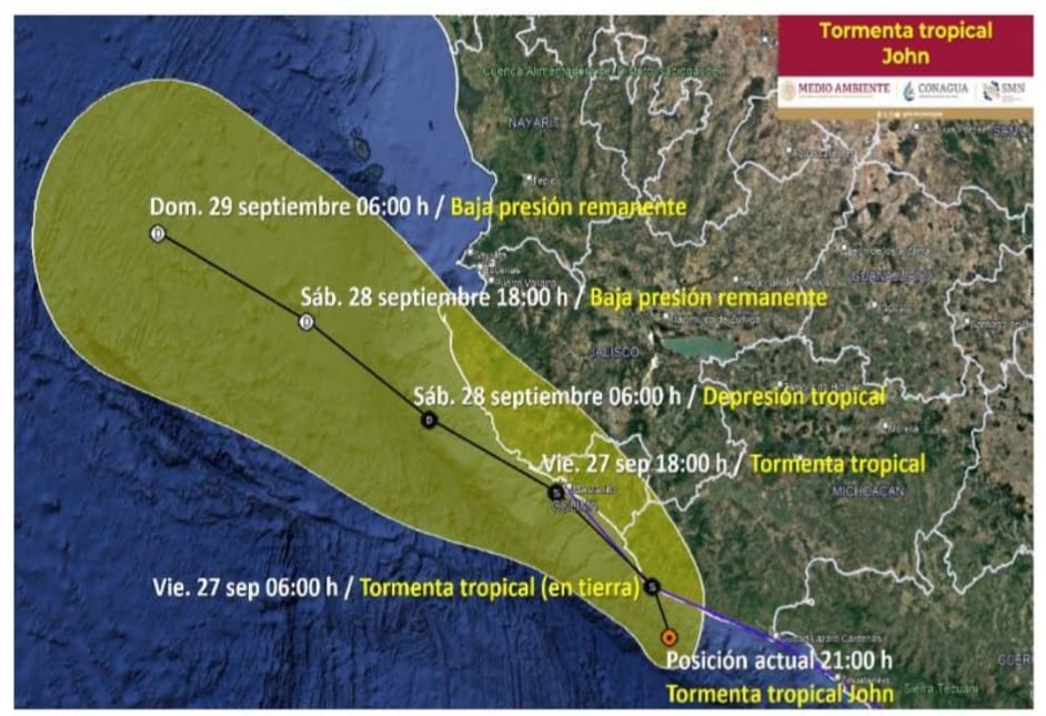 El alertamiento para estas regiones es moderado por lluvias y escurrimientos. Este fenómeno tropical se desplaza lentamente próximo a las costas de Michoacán, a las 21:00 horas de hoy, se localizó a 105 km al oeste de Lázaro Cárdenas, Michoacán y a 170 km al sureste de Manzanillo, Colima.