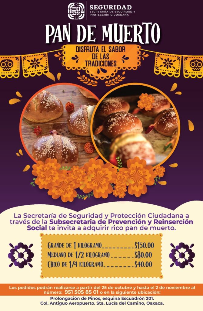 La SSPC informa que la venta de este tradicional pan está abierta al público a través de pedido previo en las instalaciones de la DEMA ubicadas en Prolongación de Pinos esquina Escuadrón 201, colonia Antiguo Aeropuerto, en Santa Lucía del Camino o al número 951 505 85 01.