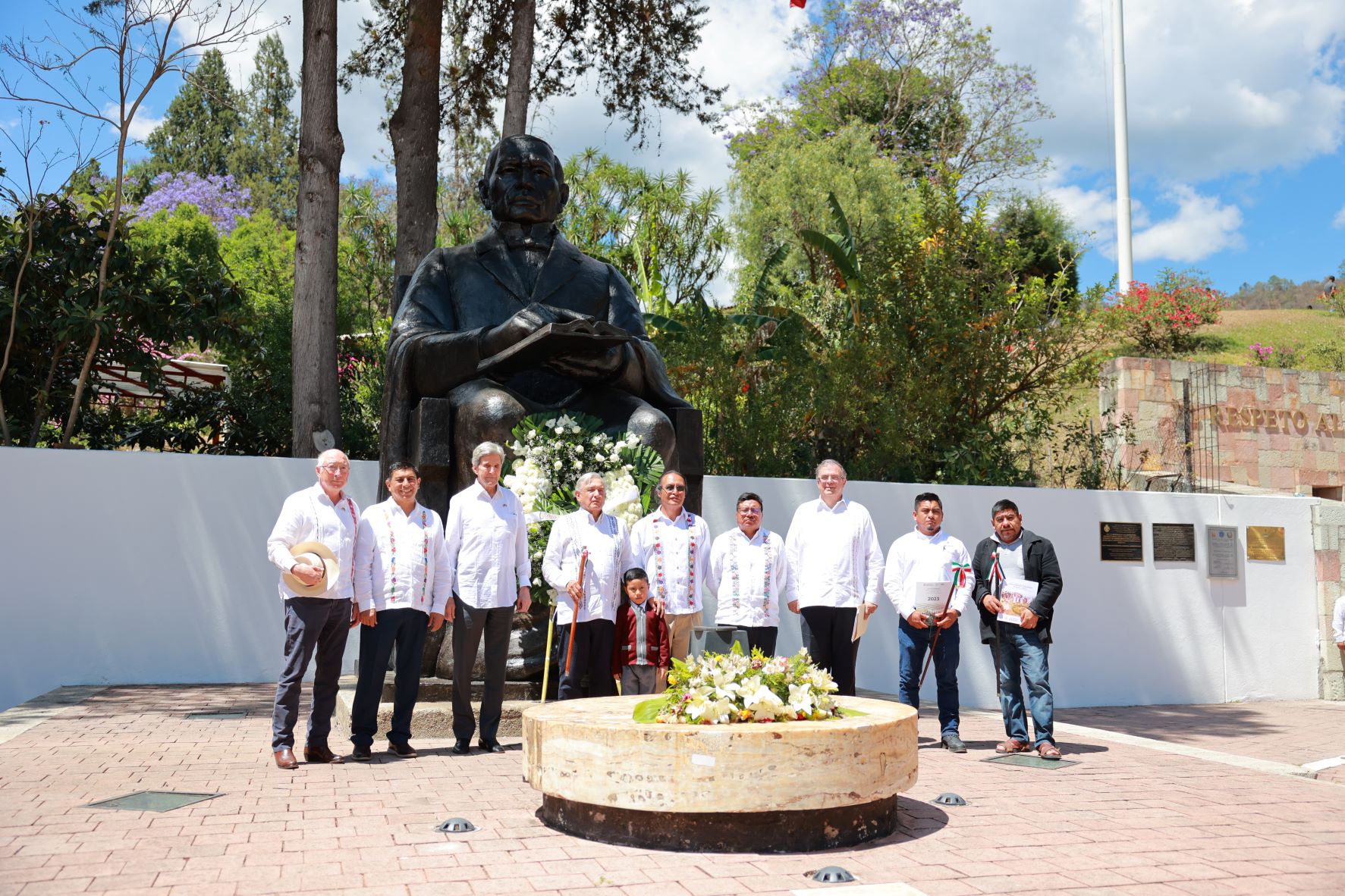 Posteriormente los asistentes montaron una guardia de honor y depositaron una ofrenda floral al monumento del Coloso de Guelatao.