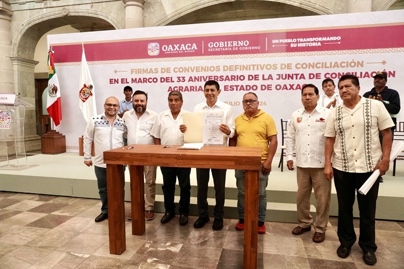 Oaxaca de Juárez, Oax. 1 de julio de 2024.- En el marco del 33 aniversario de la Junta de Conciliación Agraria del Estado de Oaxaca (JCA), el Gobernador Salomón Jara Cruz encabezó la firma de cuatro convenios de paz en materia agraria que abonan a la gobernabilidad de la entidad.