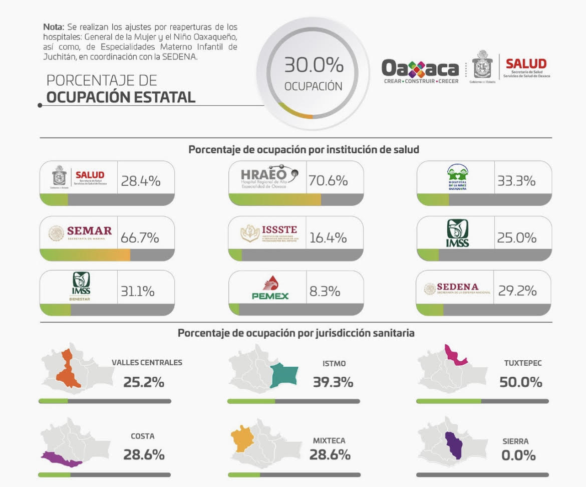 Por Jurisdicción Sanitaria, Tuxtepec cuantificó 50%, el Istmo 39.3%, seguido de la Costa con 28.6% e igual porcentaje para la Mixteca, mientras que Valles Centrales con 25.2% y la Sierra continúa en 0%. De las 413 camas destinadas para la atención de personas con esta patología, 289 están disponibles.